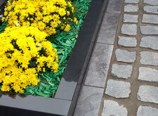 Покрасить ограду, так как чаще всего при установке ограды красят транспортировочной краской, которая приходит в негодность через год. Облицевать бетонный цоколь и бетон обрамляющий цветник. В данном случае для этого мы использовали керамогранит. Установили гранитные лавочку и столик. Посадили две туи и кустовые хризантемы в цветник. Заменили пластиковую вазу на гранитную. Уложили гранитную брусчатку на пол.